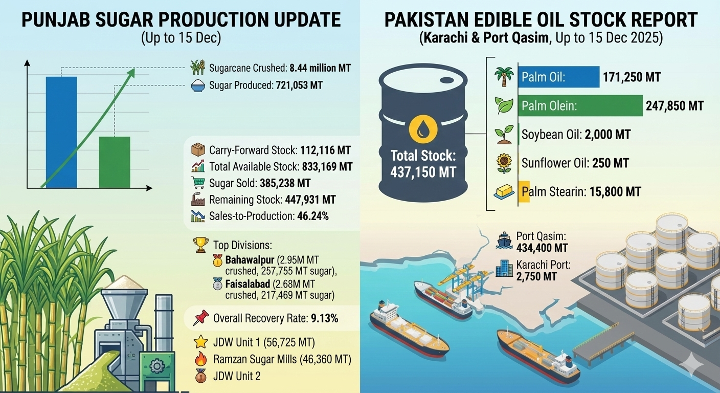 Pakistan’s weekly edible oil stock report for Karachi and Port Qasim shows a rise in overall inventories, reflecting stronger arrivals and comfortable supply conditions.