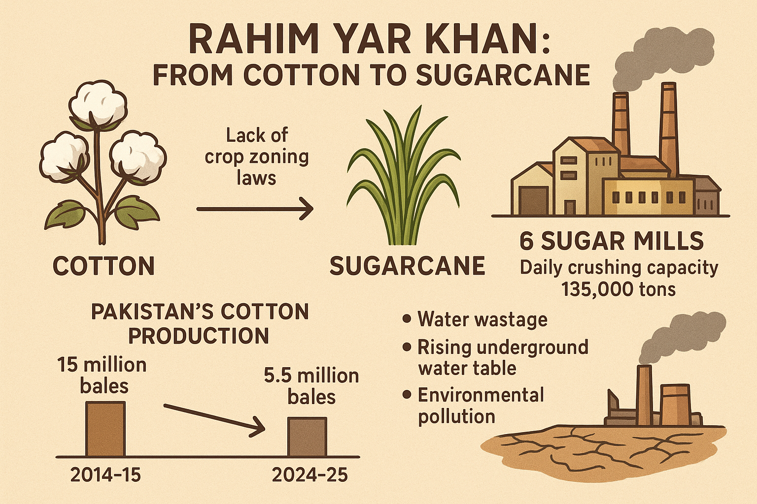 Currently, Rahim Yar Khan district has six sugar mills with a daily crushing capacity of 135,000 tons, the highest for any single district in Pakistan. As a result of this expansion, Pakistan’s overall cotton production has dropped sharply—from 15 million bales in 2014–15 to only 5.5 million bales in 2024–25.