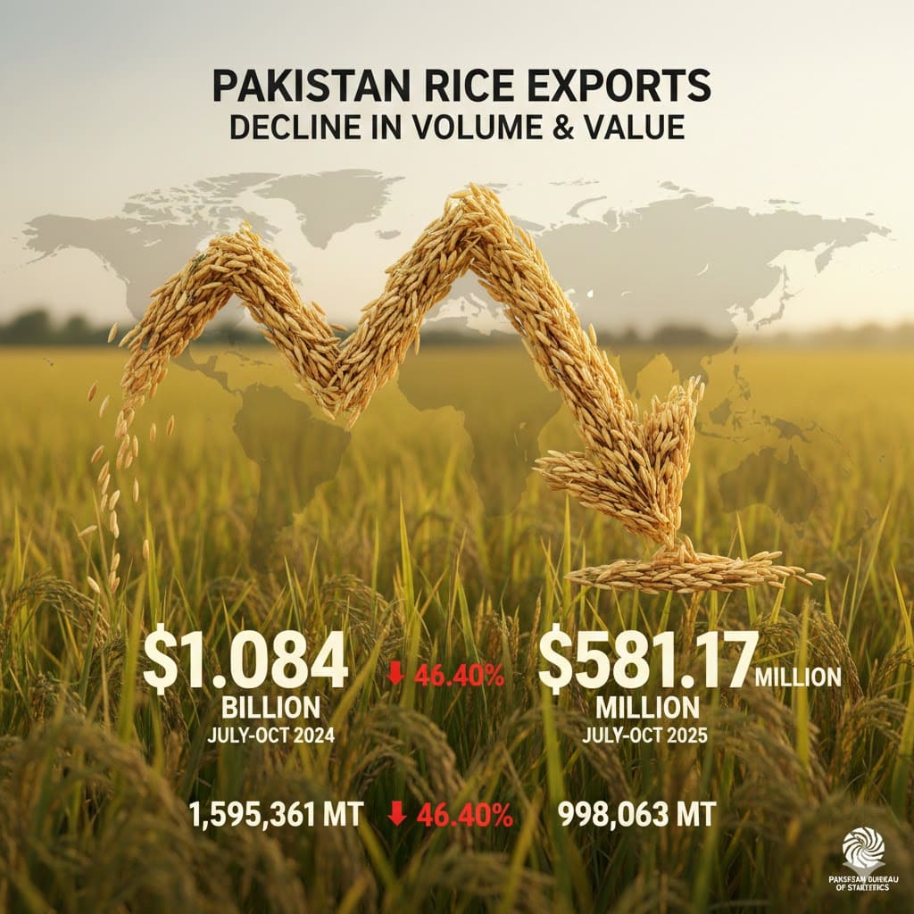 During the first four months of the current fiscal year, Pakistan exported 998,063 metric tons of rice, down from 1,595,361 metric tons in the same period last year. Between July and October 2025, rice exports earned $581.17 million, compared to $1.084 billion during the same period last year, marking a 46.40% decline in volume and value, according to the Pakistan Bureau of Statistics.