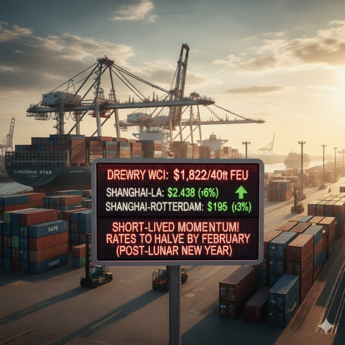 The Drewry World Container Index (WCI), a composite measure of container freight rates, continued its upward trend for the third consecutive week. The index rose by 4.35 percent to $1,822 per 40-foot equivalent unit (FEU) on October 30, up from $1,746 per FEU the previous week, following a prolonged decline over 17 consecutive weeks.