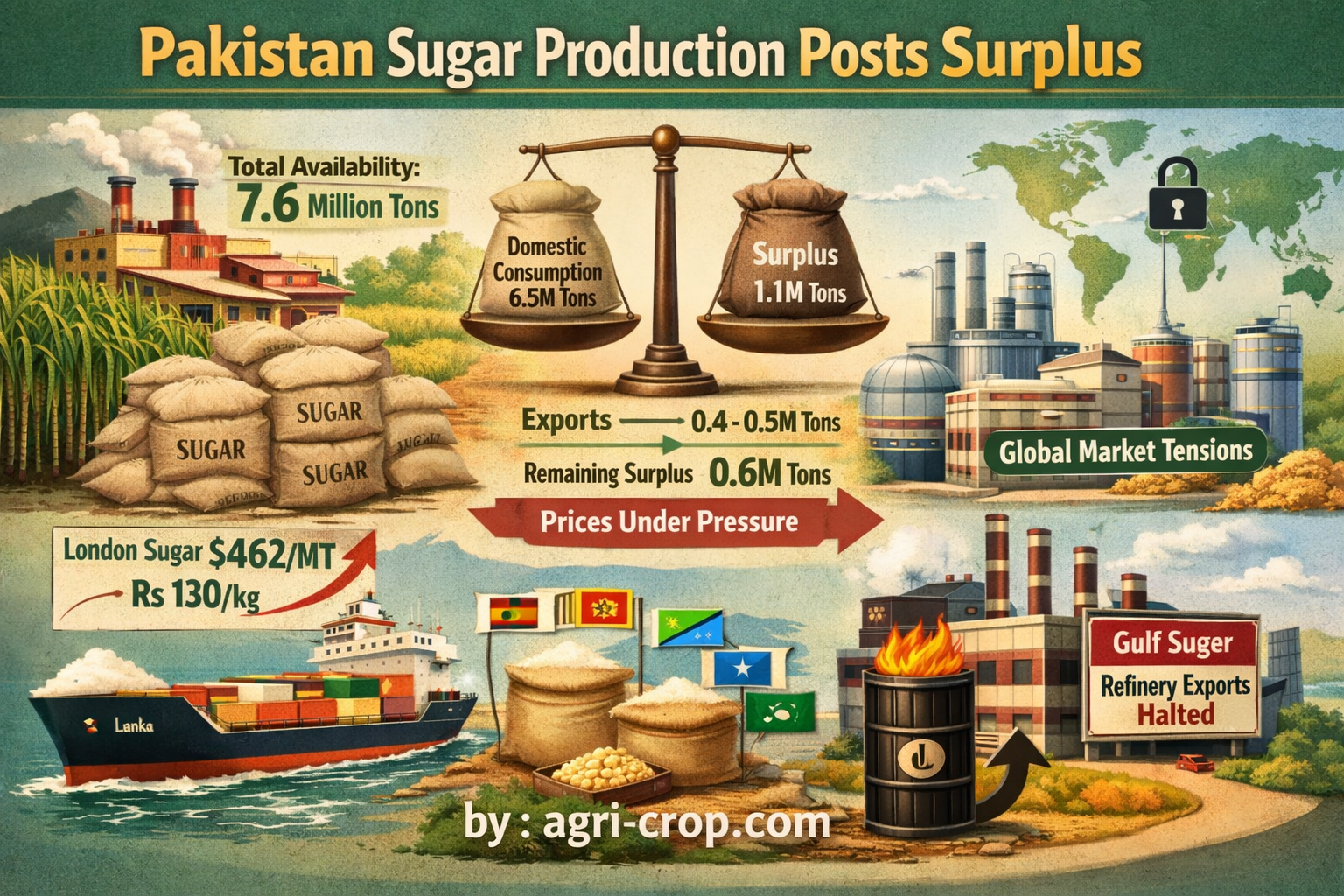 Total sugar availability is estimated at around 7.6 million tons, including approximately 7.3 million tons produced from sugarcane, 0.1 million tons from beet, 0.1 million tons as carry-forward stock, and 0.1 million tons through imports. In comparison, annual domestic consumption stands at nearly 6.5 million tons, resulting in a surplus of about 1.1 million tons.