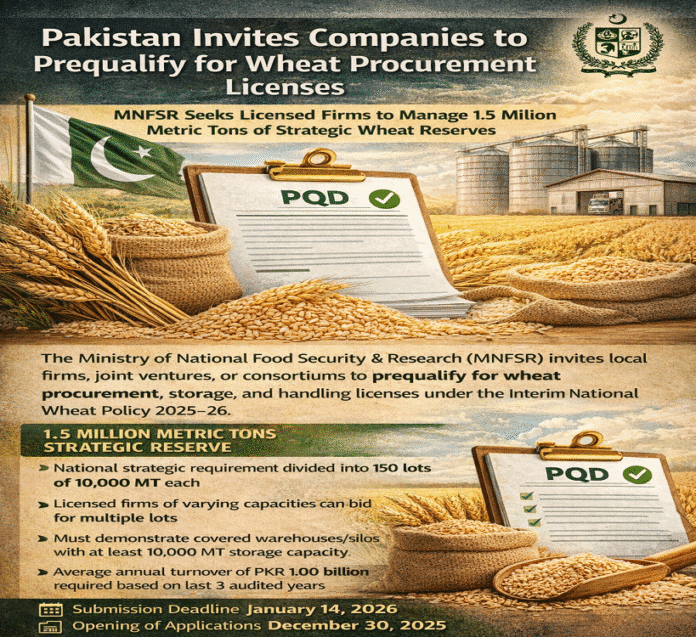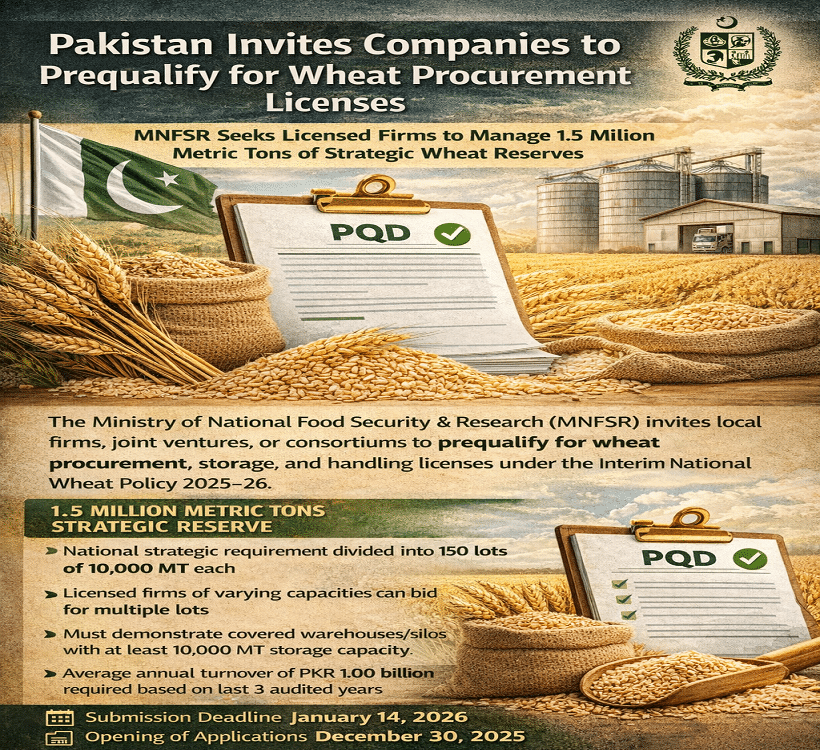The Ministry of National Food Security & Research (MNFSR) has invited local firms, joint venture or consortium to participate in the Prequalification Document (PQD) to license private companies for wheat procurement, storage, and handling under the Interim National Wheat Policy 2025–26. The PQD aims to select qualified firms to participate in wheat procurement and manage the national strategic reserve of 1.5 million metric tons (MMT) for FY 2025–26.