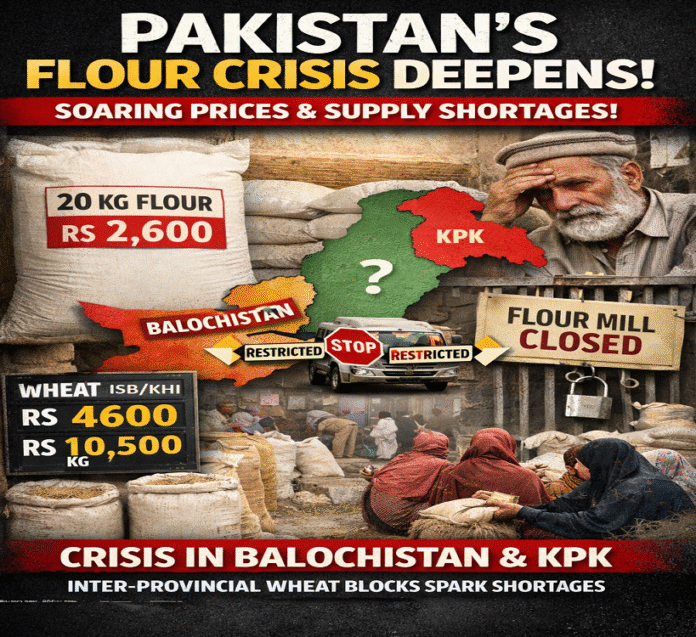A severe flour crisis has emerged across Pakistan, leading to sharp price increases and raising serious concerns about food security, particularly in Balochistan and KPK. According to market sources, flour prices in Quetta have surged over the past two weeks, with a 20 kg flour bag now selling between PKR 2,450 and PKR 2,600. In Islamabad, wheat prices have climbed to PKR 4,600 per maund, while in Sindh, wheat prices have raised to PKR 10,500 per 100 kg, reflecting nationwide pressure on staple food costs.
