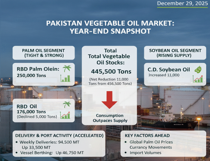 As of 29 December 2025, Pakistan’s total vegetable oil declined to 445,500 tons from 456,500 tons in the previous week, reflecting a net reduction of 11,000 tons. This confirms that consumption continues to outpace supply in the local market.