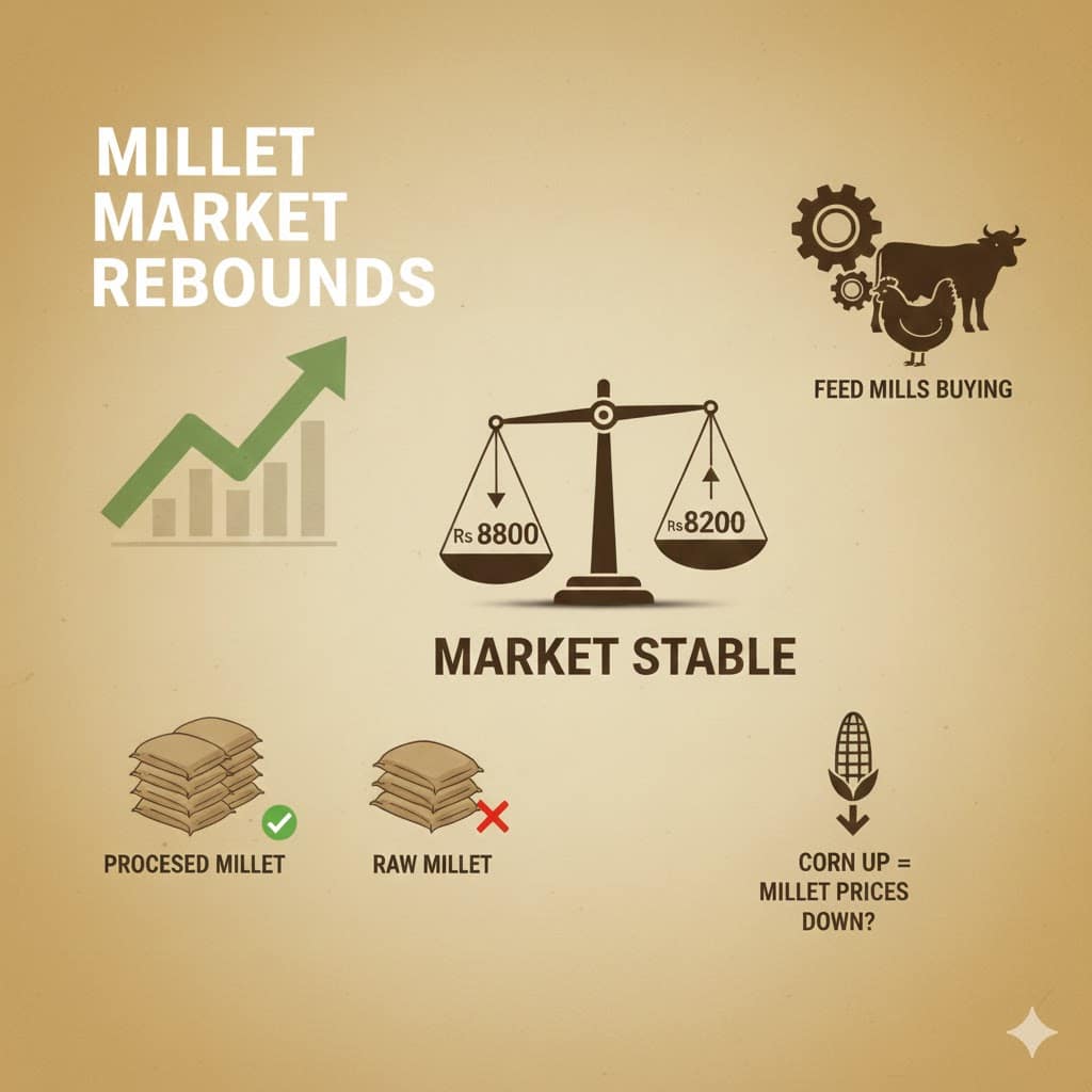 Feed mills are actively buying millet as they face a maize shortage and use it as an alternative. They currently purchase maize at Rs 3,200–3,300. However, as corn arrivals peak, millet buyers may reduce their purchases, which could drive prices lower.
