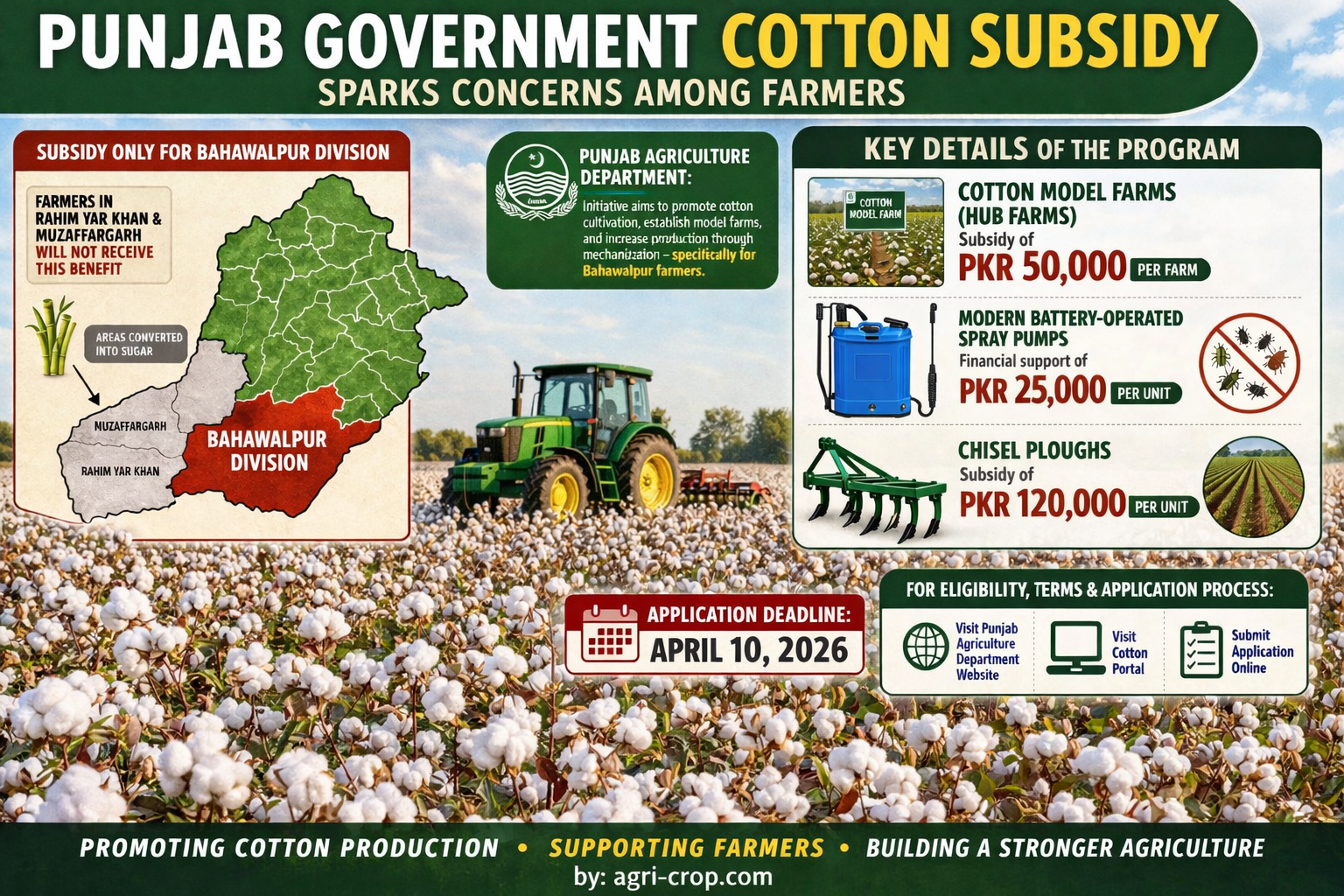 Farmers wishing to benefit from the subsidy must submit their applications by April 10, 2026. Eligibility criteria, terms and conditions, and the application process are available on the Punjab Agriculture Department website and the Cotton Portal.