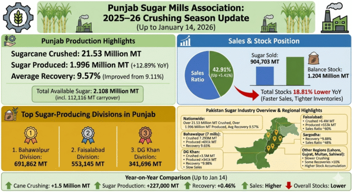 The Punjab Sugar Mills Association has released updated production data up to January 14, 2026, showing strong growth in sugarcane crushing, sugar output, and recovery rates during the 2025–26 crushing season.