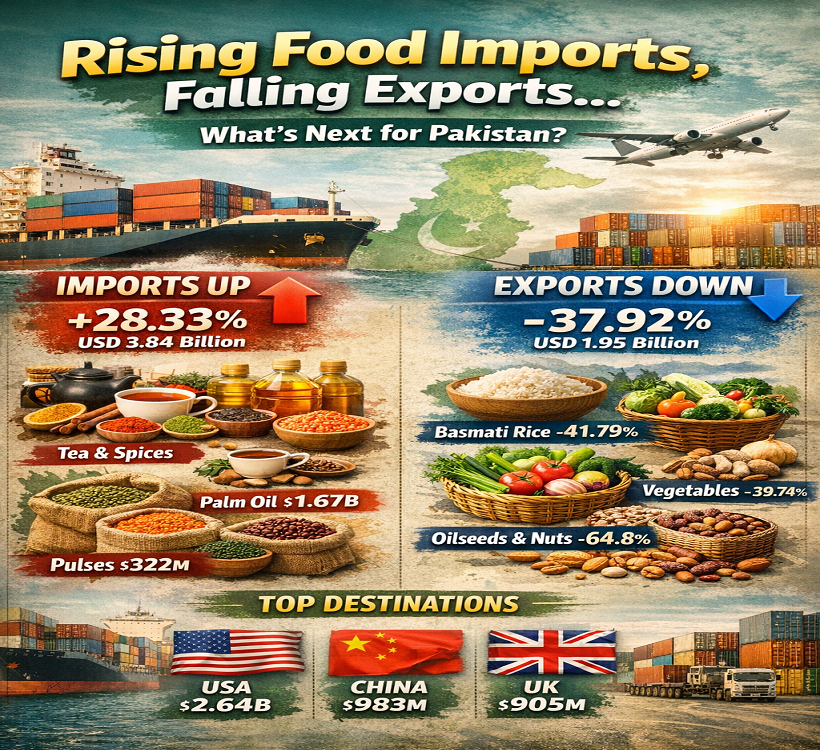 Pakistan has recorded a significant rise in food imports alongside a sharp decline in food exports. During the first five months of the current fiscal year (July–November 2025), food imports surged by 28.33% year-on-year, exceeding USD 3.84 billion compared to USD 2.998 billion in the same period last year. In contrast, food exports fell by 37.92%, totaling just over USD 1.95 billion during the same timeframe.