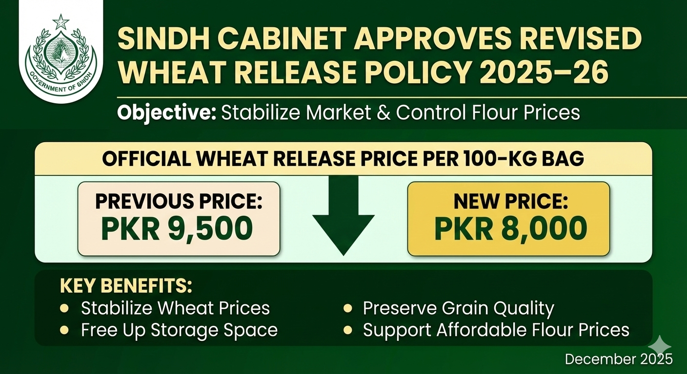 The Sindh Cabinet has approved a revised wheat release policy for the year 2025–26 with the objective of stabilizing the market and controlling flour prices. Under the new decision, the government has reduced the official wheat release price to PKR 8,000 per 100-kg bag from the earlier level of PKR 9,500. Officials stated that the revised policy aims to stabilize wheat prices, preserve grain quality through timely releases, and free up storage space ahead of the upcoming crop season. The government also expects the move to support affordable flour prices for consumers across Sindh.