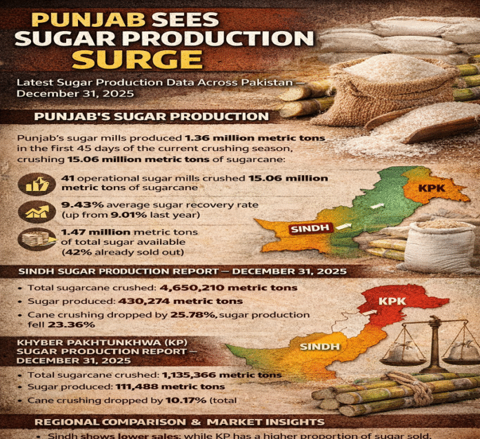 Punjab’s sugar mills produced 1.36 million metric tons of sugar during the first 45 days of the current crushing season. Across the province, 41 operational sugar mills crushed a total of 15.06 million metric tons of sugarcane by December 31, 2025. The Department of Cane Commissioners, Punjab, reported that the average sugar recovery rate reached 9.43%, up from 9.01% during the same period last year. This improvement reflects better-quality sugarcane and enhanced mill performance.