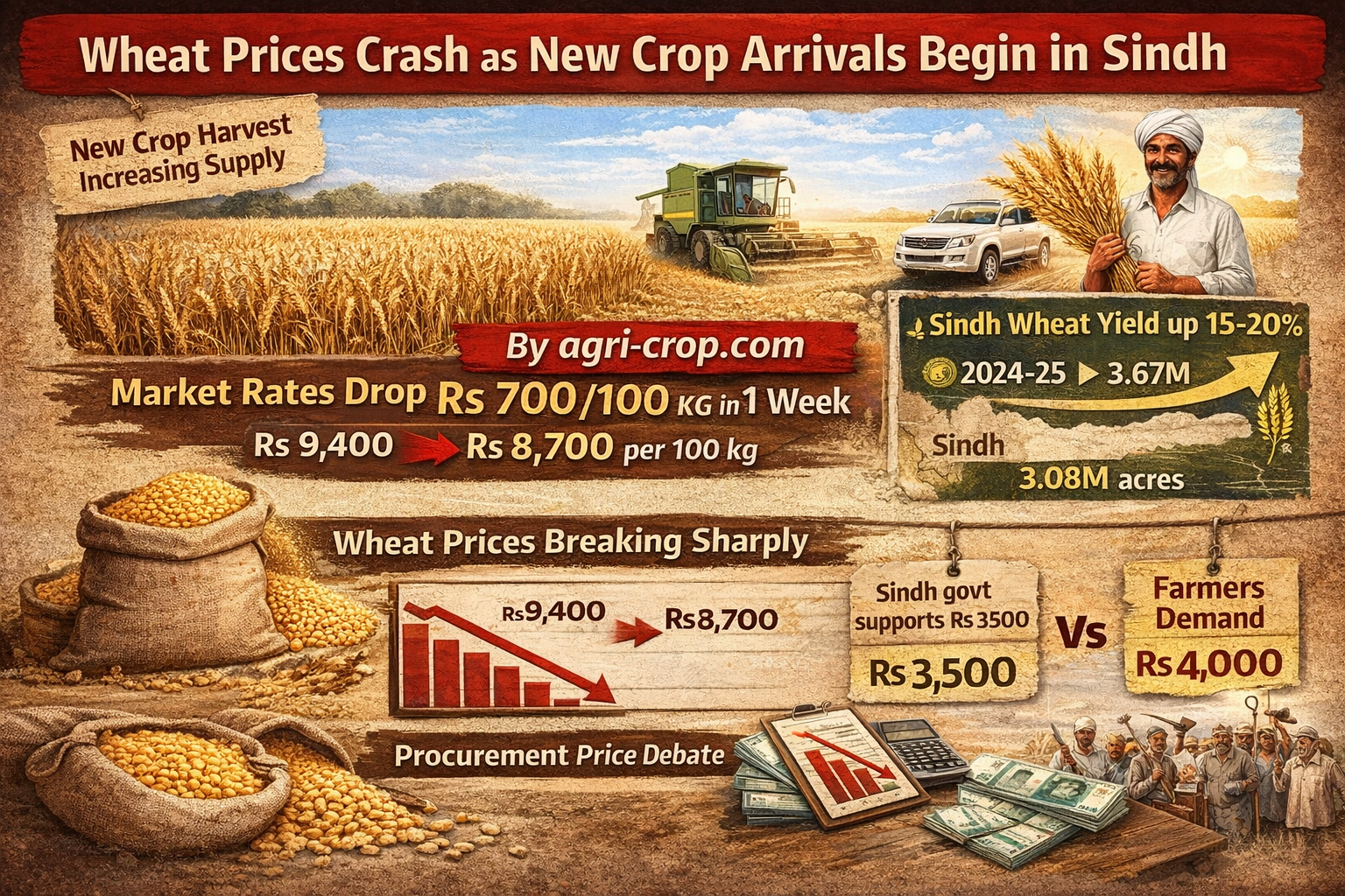Wheat prices in Pakistan have dropped sharply following the arrival of the new crop, with market rates declining by nearly Rs700 per 100 kg within a single week. The sudden correction in prices comes as fresh wheat from Sindh begins entering the market, increasing supply and shifting market sentiment.